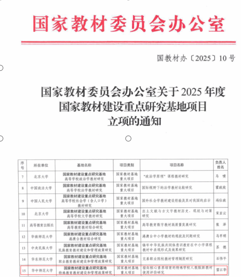 近日,国家教材委员会办公室印发《关于2025年度国家教材建设重点研究基地项目立项的通知》(国教材办〔2025〕10号),华中师范大学国家教材建设重点研究基地(特殊教育教材建设和管理政策研究)申报的项目“指向核心素养培育的特殊学校人教版新教材使用评价研究”,成功获批国家教材基地重大项目,项目负责人为雷江华教授。