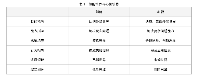 学习的发生指向学习个体与外部环境持续的意义建构,完备的学习事件包含了从知能生成到心智提升的双向过程。从心理学角度出发,知能结构是外部客体作用于个体后生成的综合认识的总和,心智结构是综合运用已有认识解决外部问题的特有认识的总和[10]。在学习事件的设计中,知能的培养是为了让学习个体更好地认识外部世界,在与认知客体进行交互的过程中可以及时提取关键信息,提高学习效果。个体运用已学知识能否解决现实问题是检验知能形成的重要指标。心智培养是为了让学习个体更好地适应、改造外部世界,在与认识客体交往的过程中发现问题,综合应用已知信息解决复杂问题。如果说知能是个体面向已知世界生成的概括思维,心智就是面向未来世界生成的分析思维与创新思维。由此可见,心智的培养指向学习个体高阶思维的提升,而知能面向低阶思维的培养,二者的具体区别见表1。